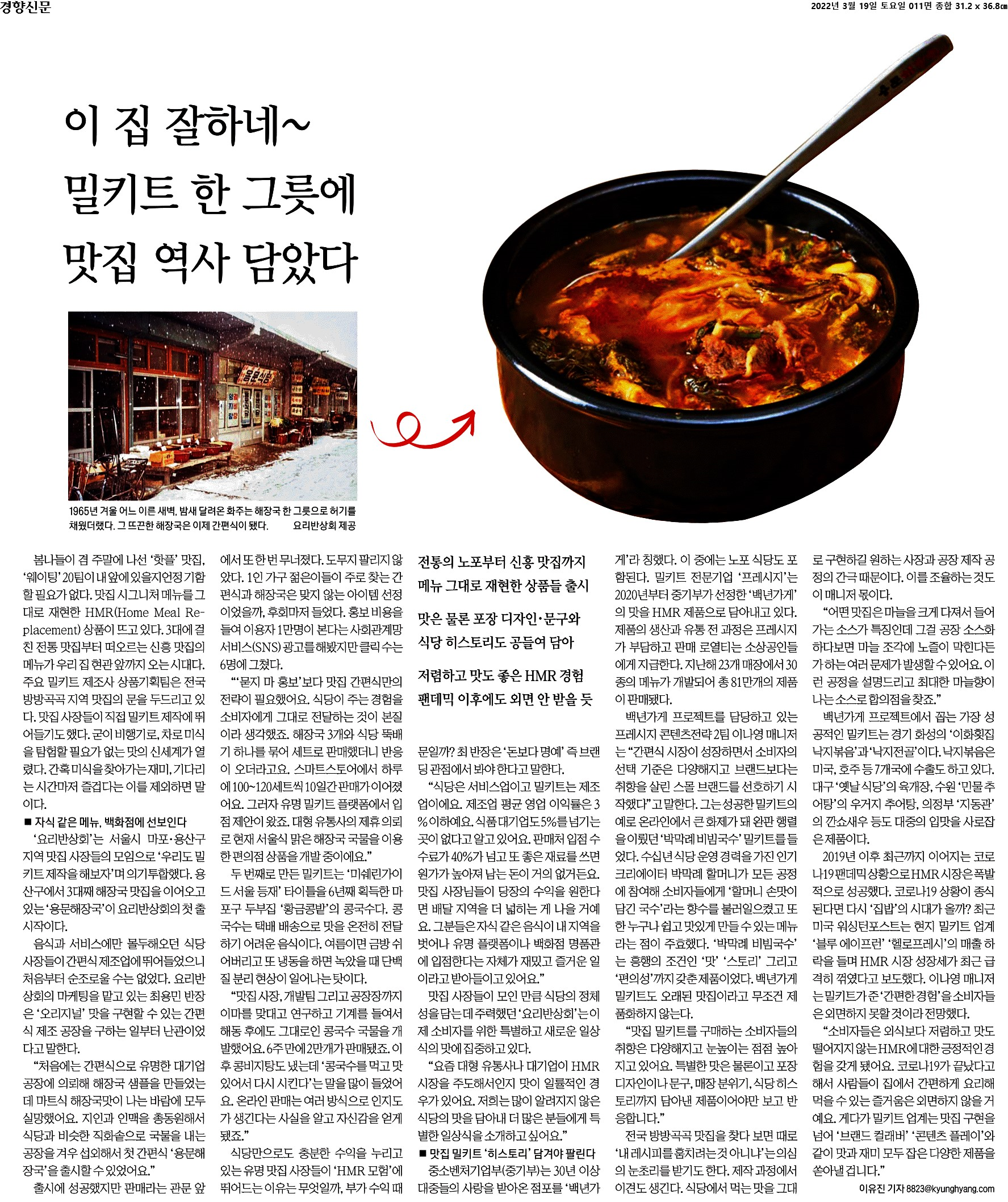 “요리로부터 세상을 자유롭게 하다”라는 브랜드 비전에 맞춰 언제 어디서나 누구의 요리도 먹을 수 있는 시대 '밀 클라우드 기업'을 핵심 브랜드 키워드로 설정하고, 전략적인 PR 활동을 전개하고 있습니다. M&A 및 브랜드 확장 시점에는 매체 인터뷰 피칭, 기업-자영업자 간 상생 기획 등 긍정적 프레임을 만들고 호감도를 제고했으며, 최근에는 메가 IP 중심 기획 피칭, 데이터 기반 인사이트 기획 등 앵글 개발을 통해 간편식 리딩 기업 포지셔닝을 공고히 했습니다.